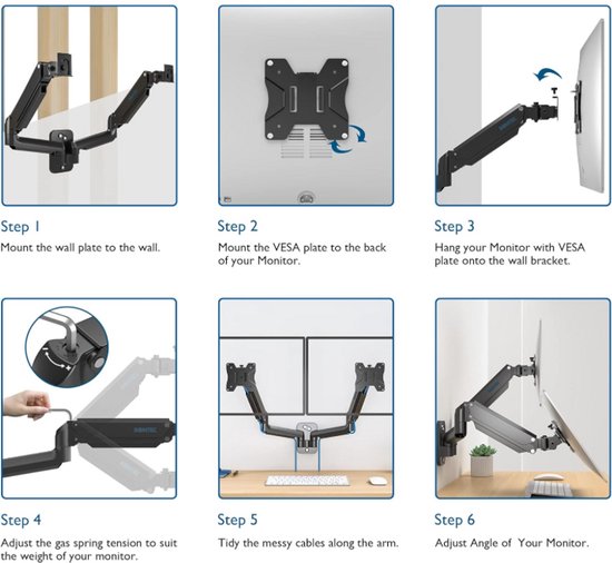 Eenvoudig te installeren: deze gasveerhouder met één arm is eenvoudig te installeren en vereist slechts drie stappen om uw monitoren te installeren. Bevestig eerst de houder aan de muur; Ten tweede sluit u uw monitor aan op het VESA-bord; Ten derde, pas de spanning aan op basis van het gewicht van de monitor. Verborgen kabelbeheer helpt bij het organiseren van kabels, wat zorgt voor een nette en opgeruimde werkplek. Compleet met twee kabelclips.
