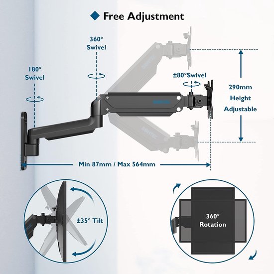 Meer ruimte en comfort: onze enkele gashefarm is geschikt voor pc-monitoren en kleine tv-schermen, ideaal voor het optimaliseren van de ruimte op kantoor en in de keuken of als extra onderdeel voor gaming-opstellingen. Deze monitorwandhouder voor 2 monitoren is uitgerust met een robuuste, in hoogte verstelbare arm en is sterk, robuust en multifunctioneel en biedt maximale ruimte en comfort.