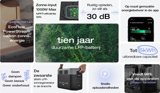 Voordelen EcoFlow Delta 2 MaxLFP-batterij: De Delta 2 Max is uitgerust met een LifePo-batterij die 3000 cycli kan doorlopen voordat de capaciteit daalt tot 80%.