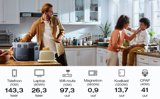 Deze nieuwe powerstation van EcoFlow is voorzien van een batterijcapaciteit van 2048 Wh en een uitgangsvermogen van 2400 W. Met de X-Boost technologie is de EcoFlow Delta 2 Max in staat om apparaten van maximaal 3100 W van stroom te voorzien. De Delta 2 Max is geschikt om te gebruiken als back-upbatterij voor thuis, waarmee je 99% van de huishoudelijke apparaten van stroom kunt voorzien, zoals een koffiezetapparaat, koelkast en waterkoker. Daarnaast Delta 2 Max gebruikt worden tijdens het kamperen, off-grid leven in campers of in vakantiehuisje. Met een totaal gewicht van 23 kg is de Delta Max licht en krachtig in vergelijking met andere powerstations met een batterijcapaciteit van 2 kWh.
