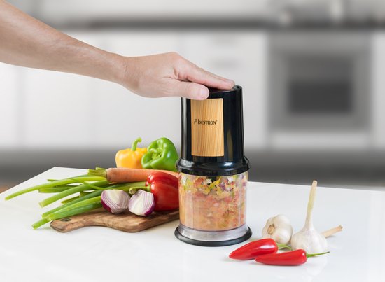 - Leveringsomvang: 1 Bestron multi-hakmolen, 400W, materiaal: rvs / kunststof, afmetingen: 13x13x25 cm, gewicht: 0,84 kg, kleur: Zwart/Hout, AKC200BW