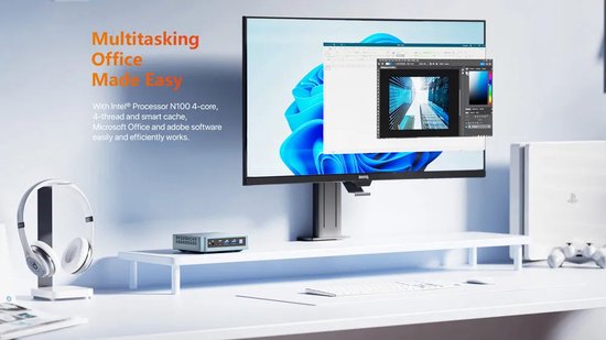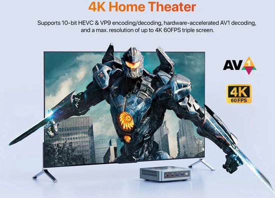 Deze mini-desktopcomputer meet slechts 4,9 x 4,4 x 1,4 inch, waardoor hij gemakkelijk mee te nemen is. Het beschikt ook over een ingebouwde slimme koelventilator voor een ruisvrije ervaring. Met Gigabit Ethernet-ondersteuning, dual-band WIFI (2.4G+5.0G) en Bluetooth 4.2 biedt de mini-pc een verscheidenheid aan connectiviteitsopties.