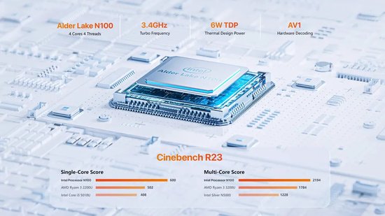 Uitgerust met een krachtige 12e generatie N100-processor (4C/4T, 6 MB Smart Cache, tot 3,4 GHz), heeft het een breed scala aan externe interfaces, waaronder USB3.0, USB2.0, Type-C en een hoofdtelefoonaansluiting van 3,5 mm , waardoor deze mini-pc een uitstekende keuze is voor uw dagelijkse werk, lichtgewicht ontwerp, online onderwijs, enz.