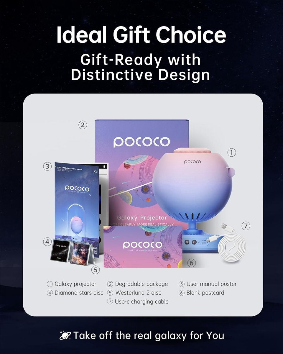 - Endless Adventures: The POCOCO Galaxy Lite Projector offers a new cosmic experience every day. Includes 2 discs - ① Galaxy Traveler ② Westeros 2... Explore various scenes and moods by easily switching between these captivating discs. Look forward to continuous disc collection updates and an ever-expanding variety.