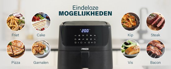 Met 1800 watt vermogen en een digitaal bedieningspaneel met 12 voorgeprogrammeerde programma's, maakt de Princess Airfryer koken efficiënter. De digitale timer (maximaal 60 minuten) en automatische uitschakeling dragen bij aan het energiezuinige ontwerp.