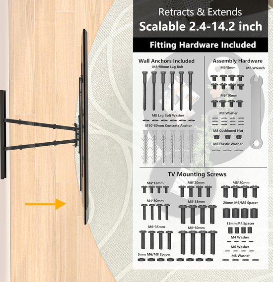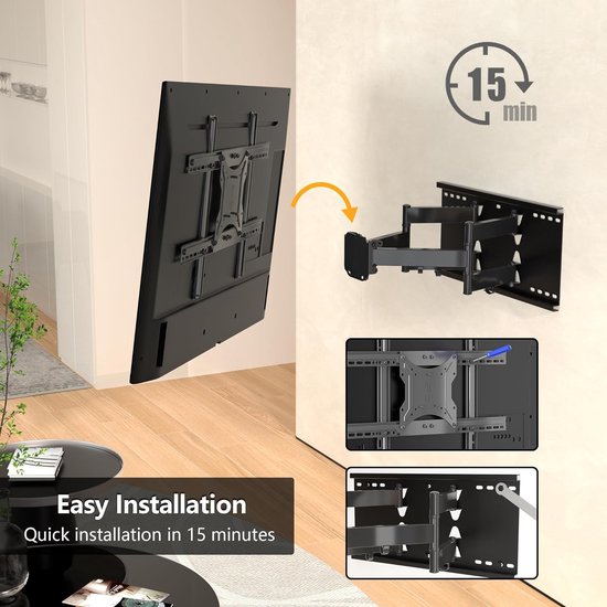 - Ultradun aan de muur en groot bereik: uittrekbaar tot 360 mm van de muur, zodat je je tv indien nodig in de perfecte positie kunt brengen. De TV muurbeugel kan 60 mm naar de muur worden getrokken, om ruimte in je woonkamer te besparen en tegelijkertijd een slank, elegant uiterlijk te behouden.