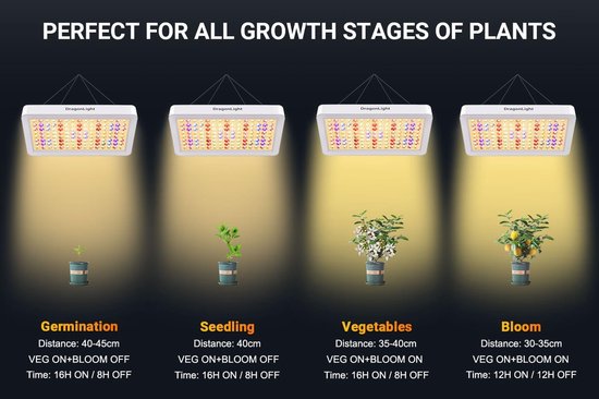 - MAIN COVERAGE/FULL SPECTRUM - Coverage area twice as efficient as all Reflector series fixtures, perfect for growing area from 60x60cm to 45cm height. DragonLight LED grow lights provide full spectrum lighting between 395nm and 730nm (included) UV+IR, natural light for plants at all growth stages, from vegetables to flowers.