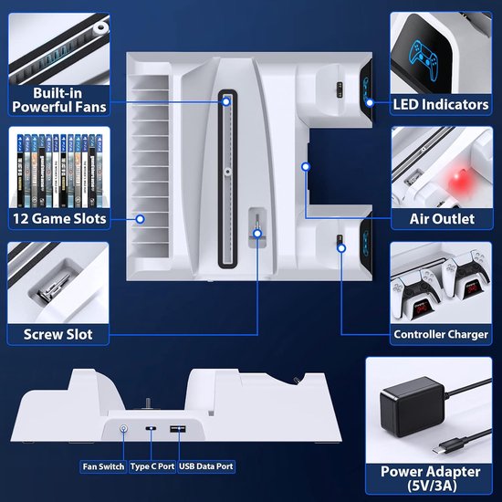 Deze PS5 koelstandaard met efficiënte koelventilatoren en dubbel PS5-controllerlaadstation, twee 2.0 USB-poorten, LED-oplaadindicatoren, 12 PS5-gamehouder, schroefopslag, 2 in 1 USB-C kabel, waardoor alles netjes en opgeruimd blijft, rijkere functionaliteit maken deze PS5-accessoires een betere vervanging voor OEM-officiële PS5 Dual5 Sense laadstation.