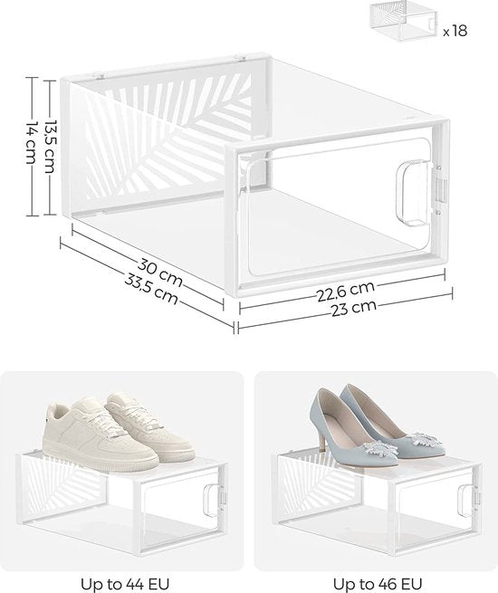 - Set van 12 stuks: deze 12 eenvoudig te monteren schoenendozen met een binnenmaat van 30 x 22,6 x 13,5 cm zijn geschikt voor maten tot 44 om je sneakers, ballerina's, pantoffels en hoge hakken op te bergen