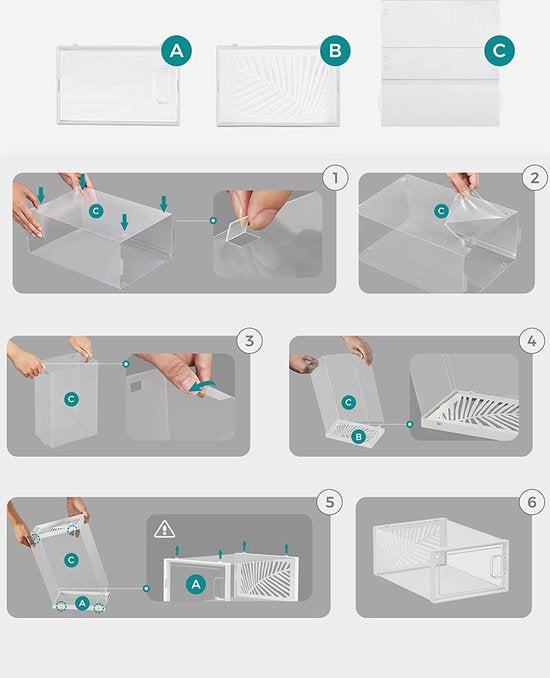 - Stapelbaar en stabiel: de vouwwanden zijn gemaakt van PET en het frame met clips is gemaakt van stevig ABS plastic. Deze boxen staan stabiel, zelfs als ze meerdere keren hoog gestapeld zijn. Je kunt een a3 schoenentoren gebruiken om ruimte te besparen en je collecties te laten zien.
