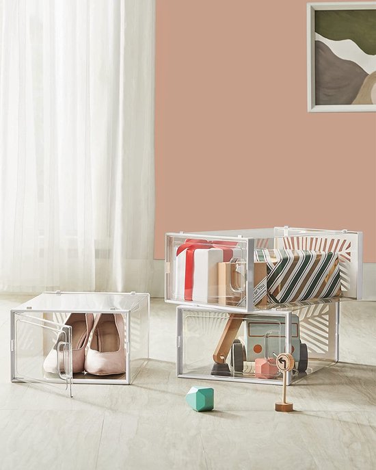 - Veelzijdig gebruik: deze organisers kunnen worden gebruikt als schoenendozen in je kledingkast, slaapkamer of hal. Ideaal voor het opbergen van je kleding, voorraad, kleine voorwerpen, enz.