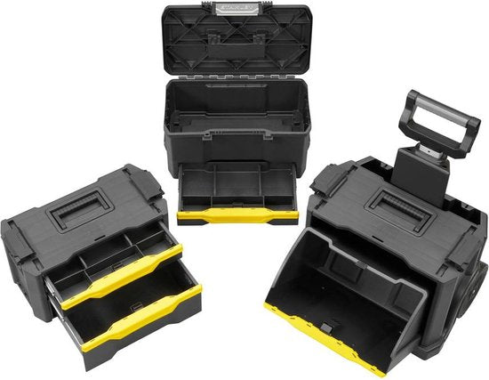 De STANLEY gereedschapswagens zijn voorzien van opbergvakken in het deksel, een afneembare koffer voor klein handgereedschap en een grote koffer voor groter materiaal en machines. Tot slot zijn ze voorzien van sluitingen die je met één hand kan openen en sluiten.